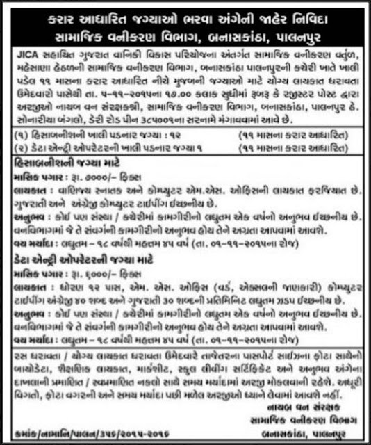 Gujarat Forestry Development Project (GFDP) Banaskantha Bharti 2015 for Accountant & Data Entry Operators: Gujarat Forestry Development Project (GFDP), Panalpur has issued a recruitment notification for recruitment of Accountant & Data Entry Operators posts vacancy. Eligible candidates can apply offline on or before 05-11-2015.